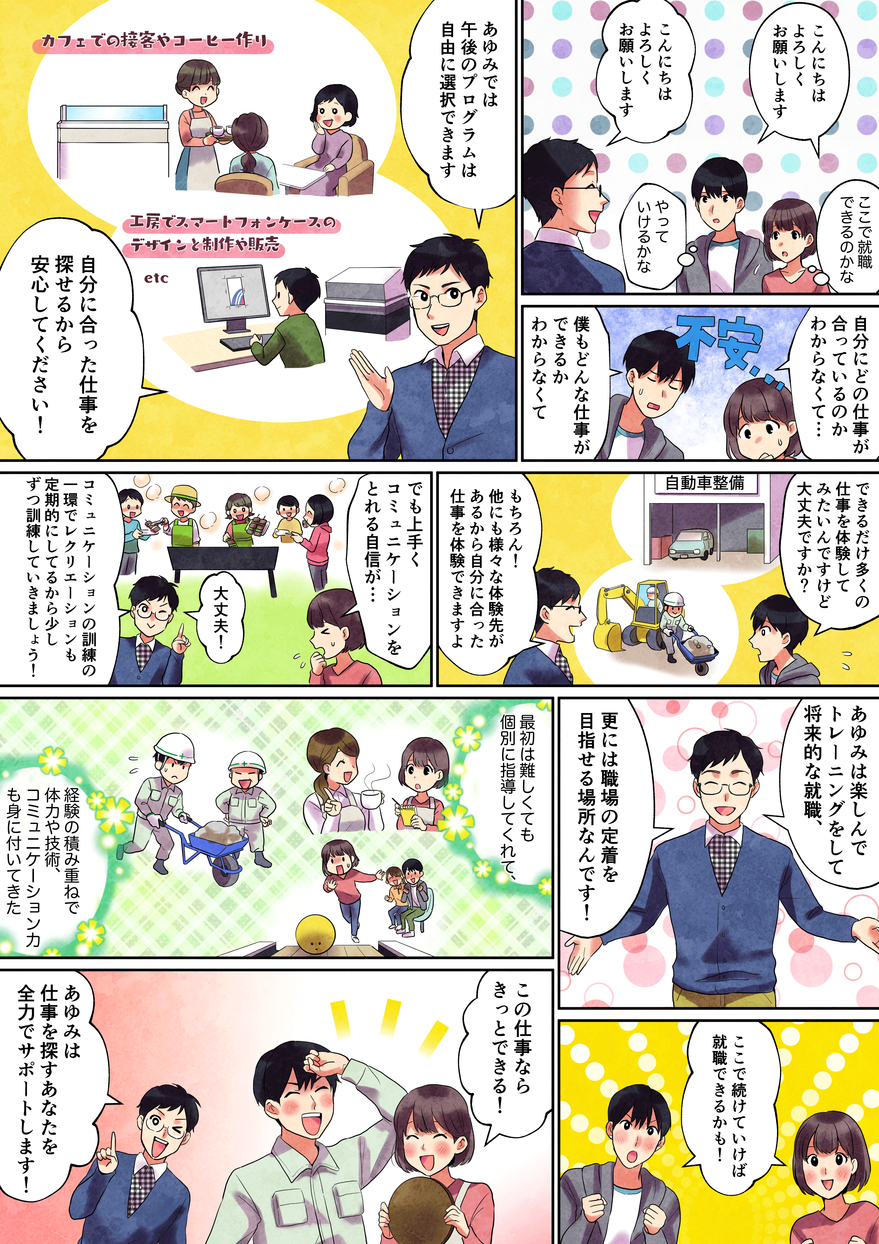 作業を通じてどんなことを取り組むのか、作業以外にも講習会、余暇活動、生活面での取り組みをどのようにして行っているのか、また、就職後に職場で長く働き続けるために行っているアフターフォローについて等ご説明いたします。